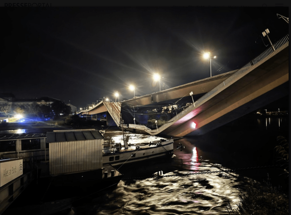 Aus noch unbekannter Ursache ist es in den frühen Morgenstunden zu einem Teileinsturz der Carolabrücke gekommen. Auf einer Länge von etwa 100 Metern ist der Teil, auf welchem normalerweise die Straßenbahnen verkehren, in die Elbe gestürzt. Am Brückenkopf auf der Altstädter Seite hat sich auf einer Länge von etwa einem Meter ein Spalt gebildet. Darüber hinaus ist es in diesem Zuge zu einem Defekt an zwei 500er Leitungen der Fernwärme gekommen. Das ausströmende Wasser hat Teile des Terrassenufers komplett unter Wasser gestellt. Durch die Einsatzkräfte wurde der gesamte Bereich um die Carolabrücke sowie die Brücke selbst gesperrt. Davon betroffen ist auch der Elberadweg, das Terrassenufer sowie die Bundeswasserstraße Elbe. Personen kamen bislang nicht zu Schaden. Gegenwärtig finden sich die Sachverständigen der einzelnen Gewerke, der Stadtverwaltung und aller beteiligten Partner ein, um das weitere Vorgehen zu besprechen. Auf Grund des Defektes der Fernwärmeleitungen, fällt im gesamten Stadtgebiet momentan die Fernwärme aus. Wir bitten die Bevölkerung den Bereich weiträumig zu meiden und die Einsatzkräfte nicht zu behindern! Wir informieren über die Kanäle der Feuerwehr und der Landeshauptstadt Dresden bei Facebook, Instagram und Threads über die weiteren Einsatzmaßnahmen.