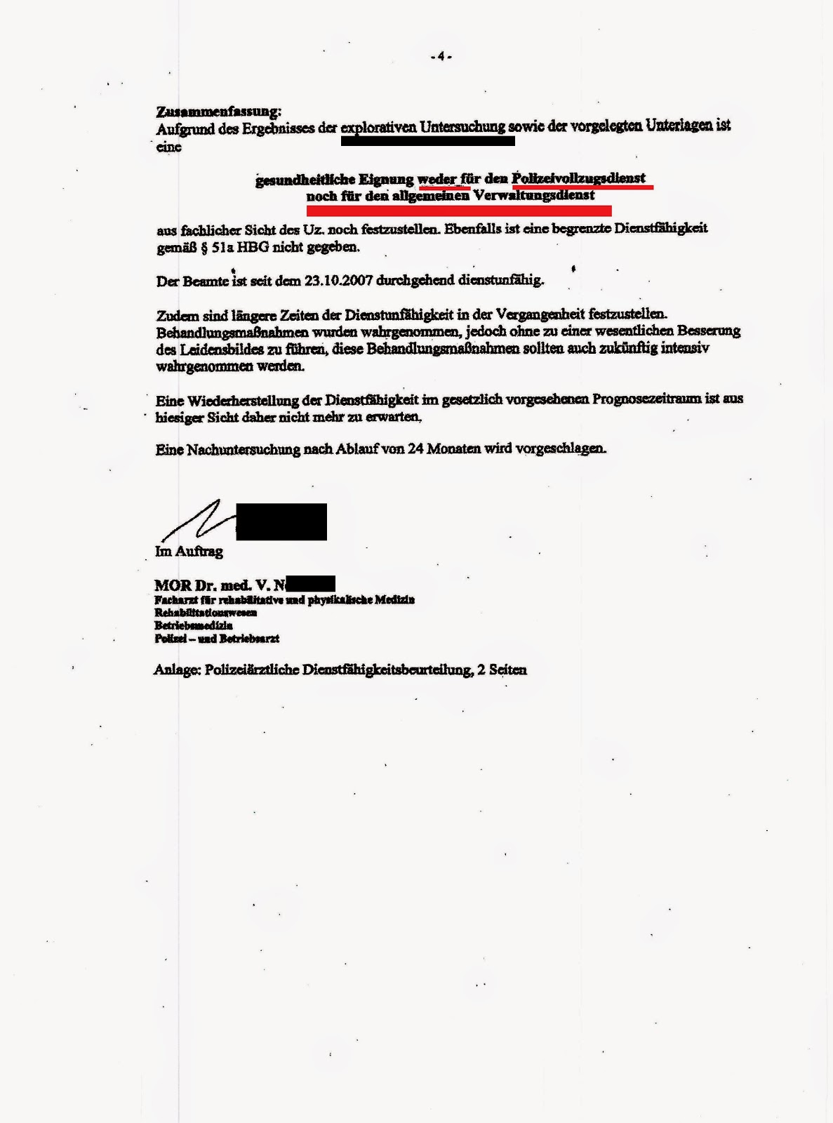 wurde dem Probanden nie durch Dr. N. eröffnet und nur die Polizeidienstuntauglich